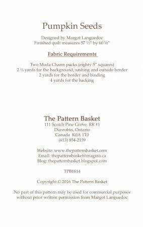 Unleash your creativity with the Pumpkin Seeds quilt pattern by The Pattern Basket. Perfect for both seasoned quilters and enthusiastic beginners, this pattern guides you in crafting a charming 57.5" x 60.5" quilt that exudes warmth and personality. The vibrant design, featuring a delightful mix of autumnal hues and playful patterns, makes it an ideal addition to your cozy home decor or a heartfelt handmade gift. With easy-to-follow instructions and fabric requirements, including two Moda Charm packs, this project promises a rewarding quilting experience. Embrace the art of quilting and create a masterpiece that will be cherished for years to come.